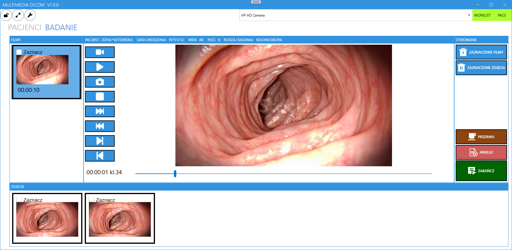 Multimedia DICOM umożliwia bezpośrednie nagrywanie filmów z podłączonego źródła wideo, np. z badania endoskopowego. Proces nagrywania może być sterowany zdalnie, co jest szczególnie przydatne w sytuacjach, gdy komputer znajduje się z dala od stanowiska badawczego.